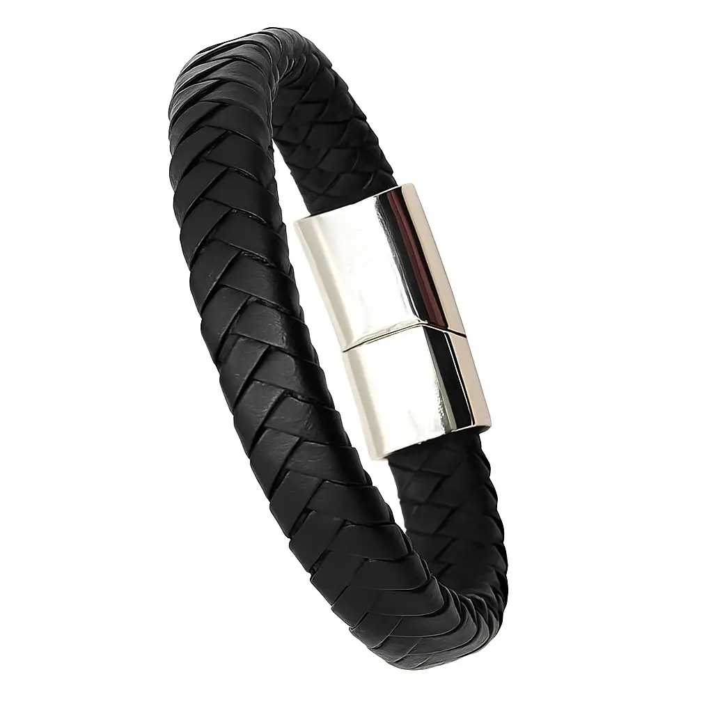 Cuero trenzado de buena calidad, suave y resistente. Cierre magnético de acero inoxidable, seguro y práctico.