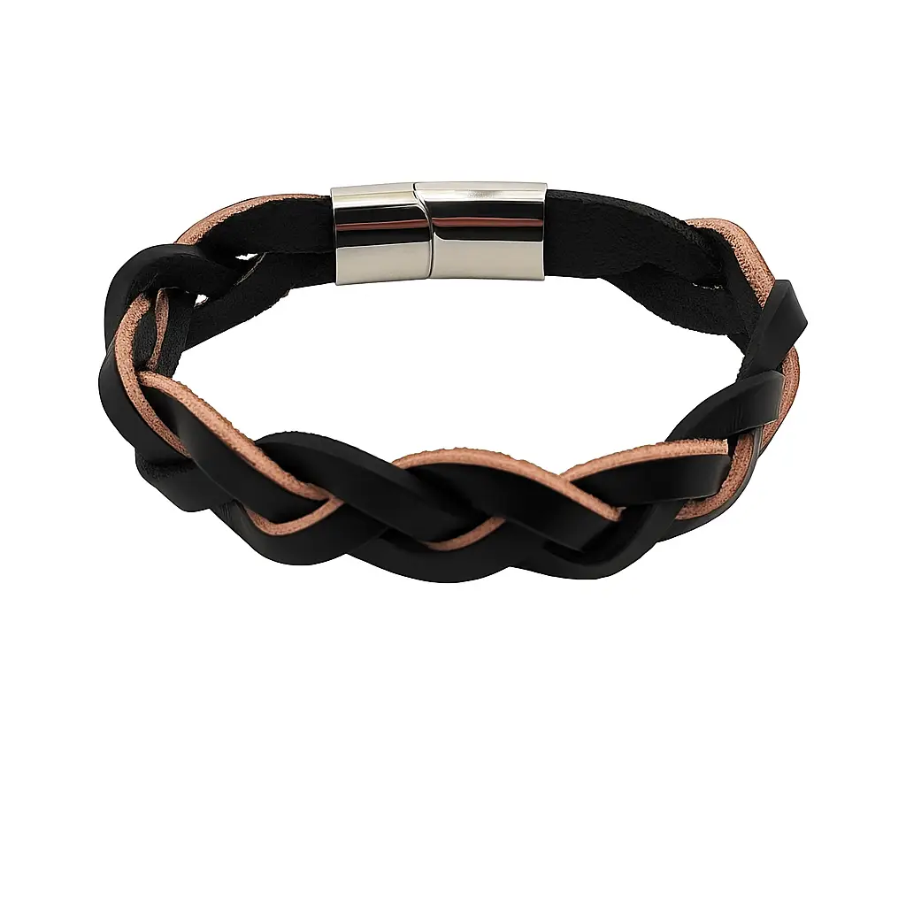 La Pulsera artesanal trenzada de cuero con cierre metálico magnético combina la elegancia natural del cuero genuino con la practicidad de un cierre resistente y moderno.