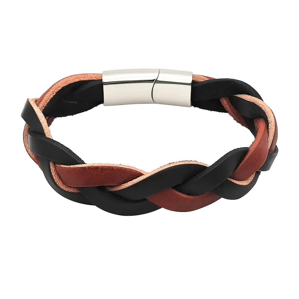 Este brazalete artesanal trenzada de cuero con cierre metálico magnético destaca por su estructura robusta y su diseño sobrio.