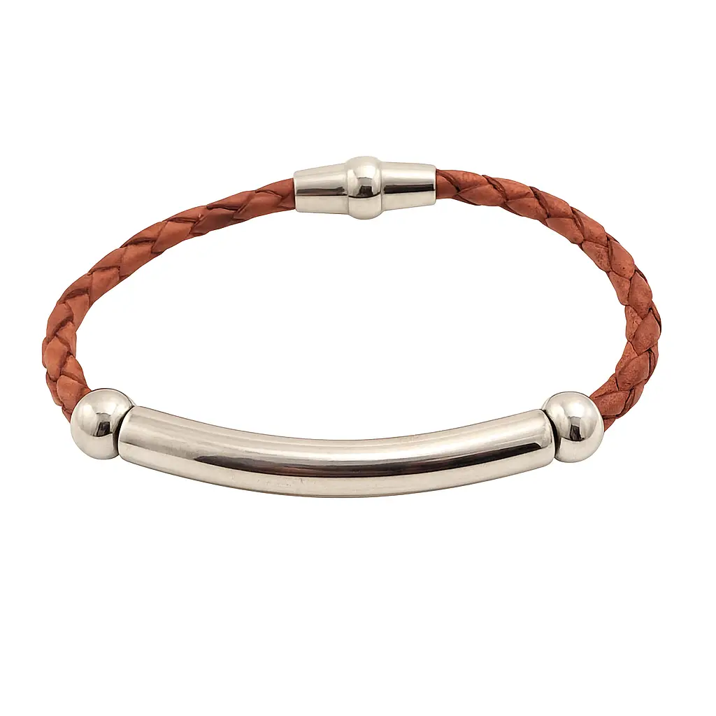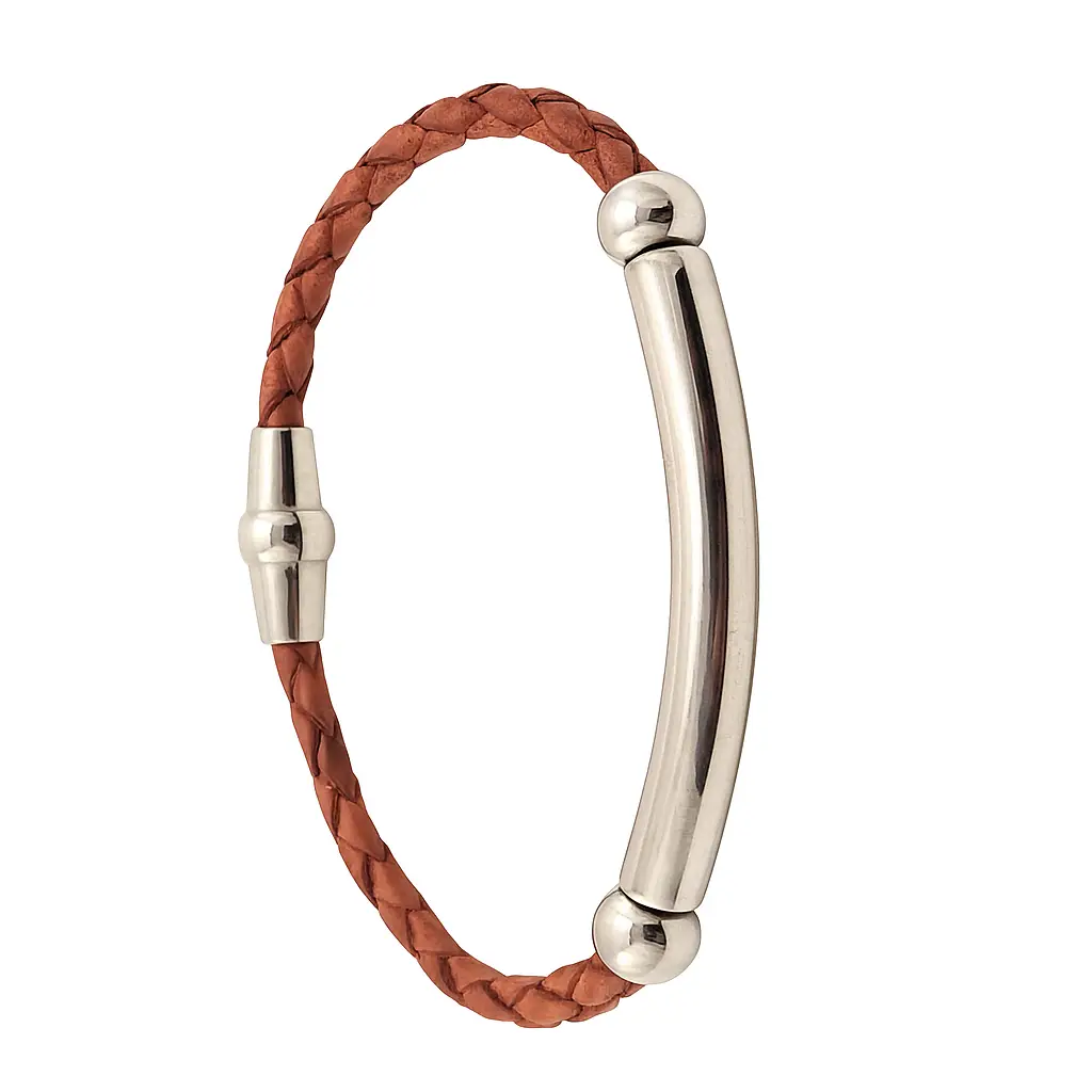 La Pulsera Cuero Trenzado Barra acero combina la resistencia del acero 316 con la calidez del cuero natural.