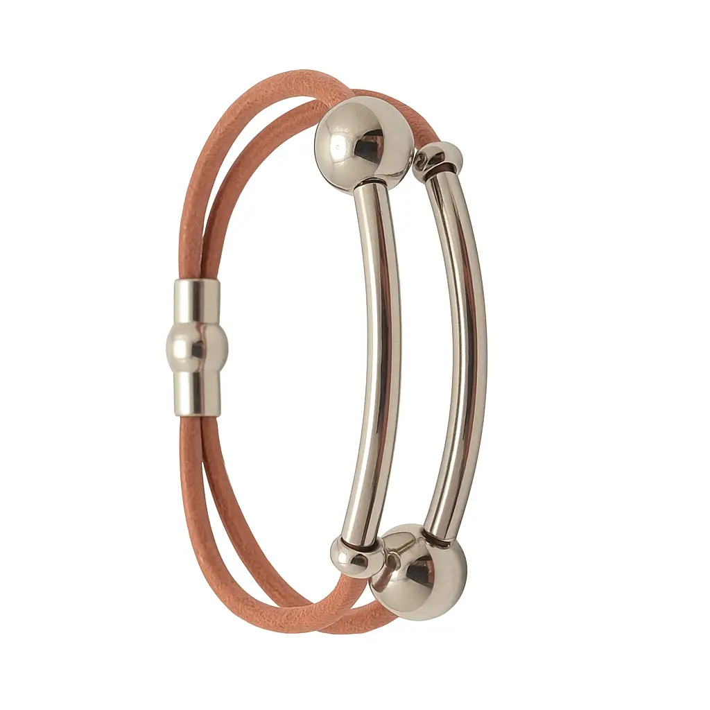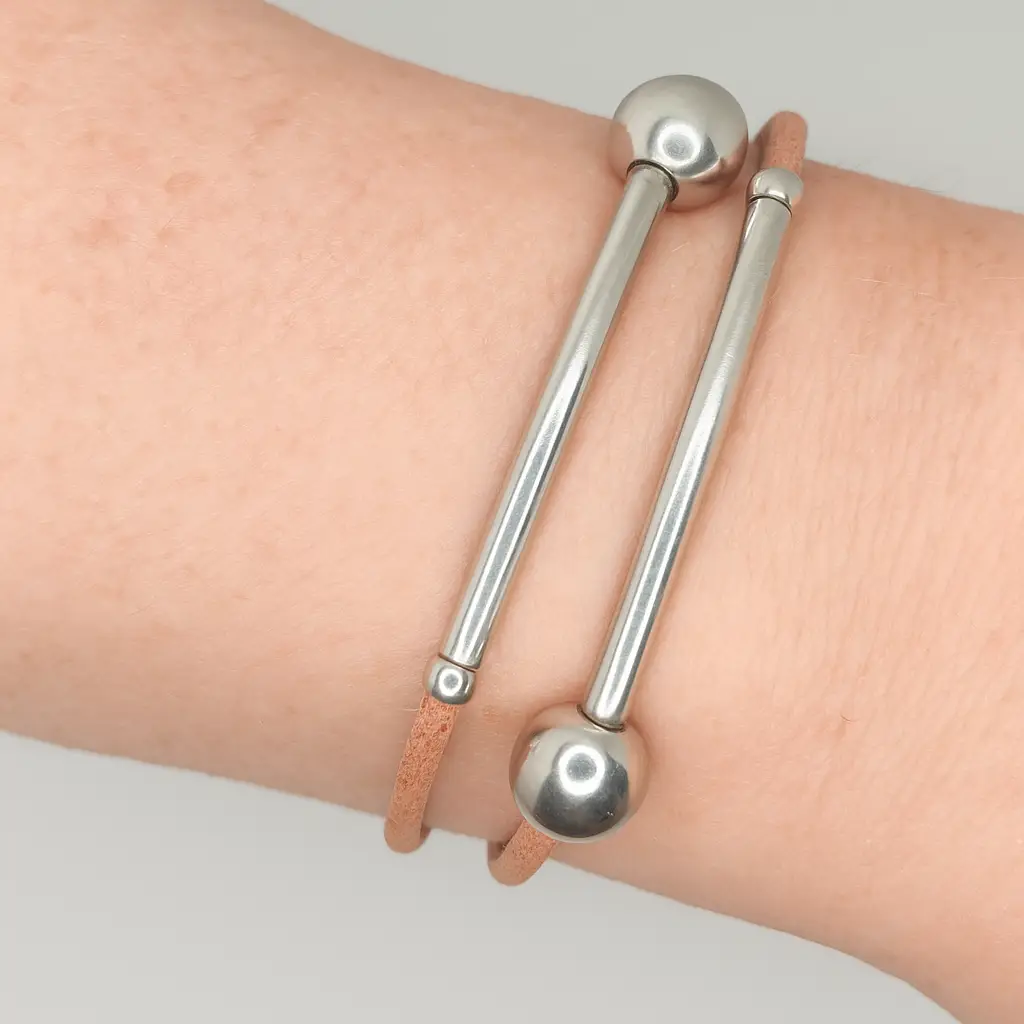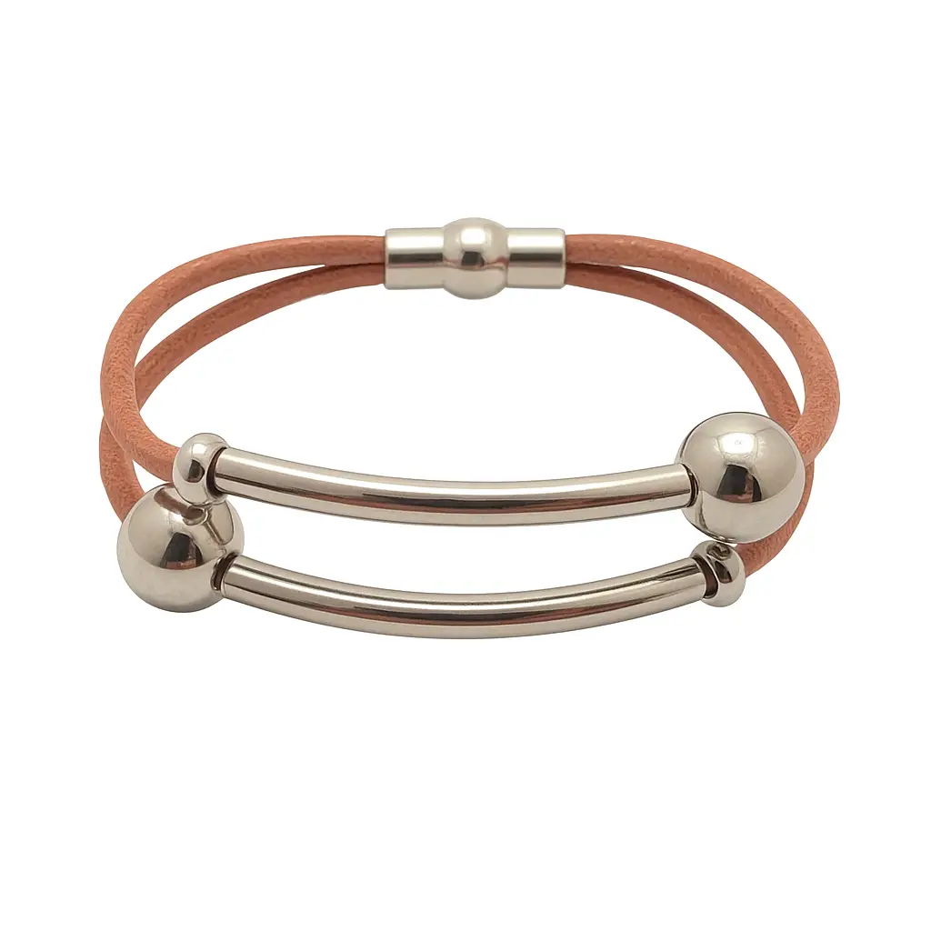 La Pulsera Doble de Cuero con Abalorios de Acero combina elegancia, fuerza y artesanía en una sola pieza.