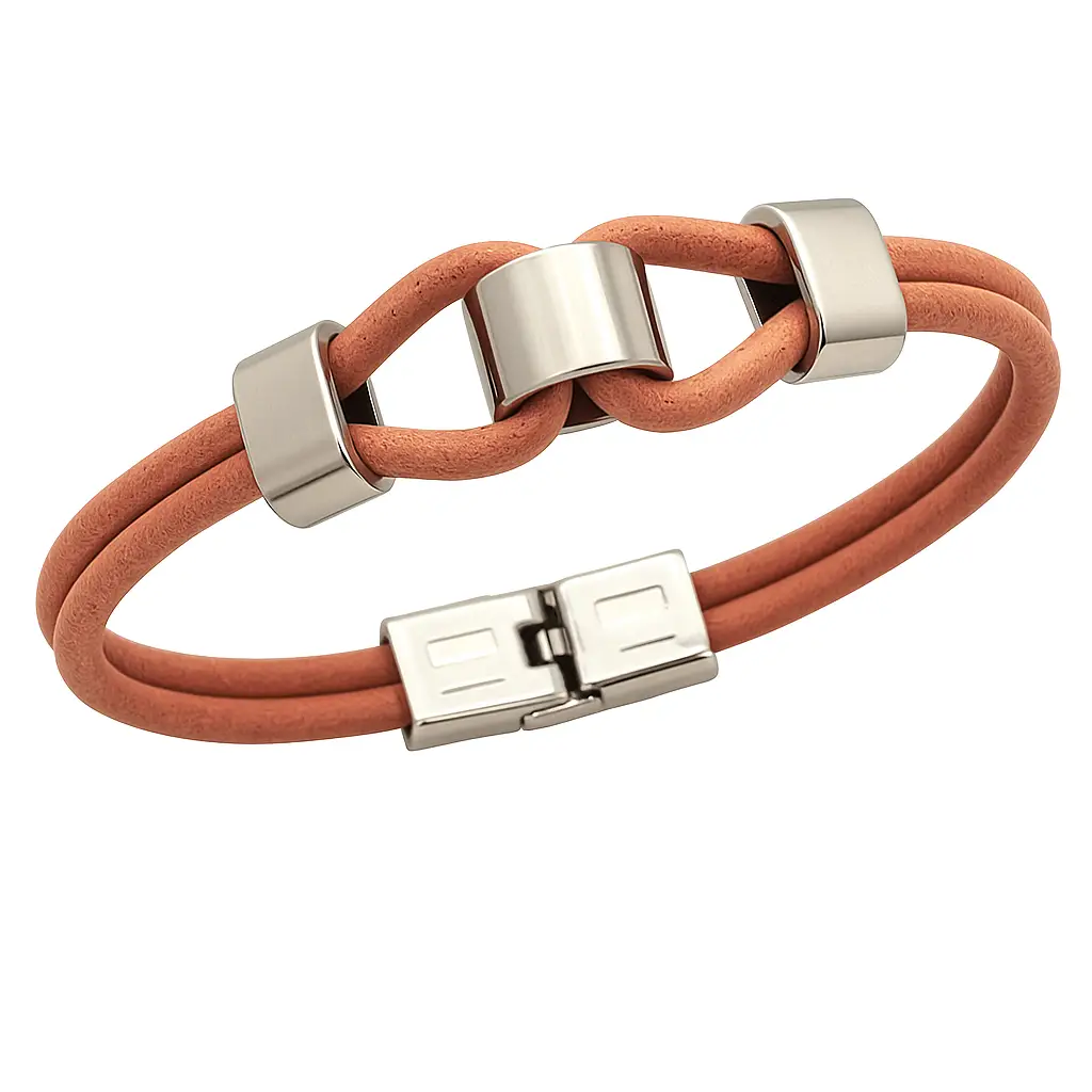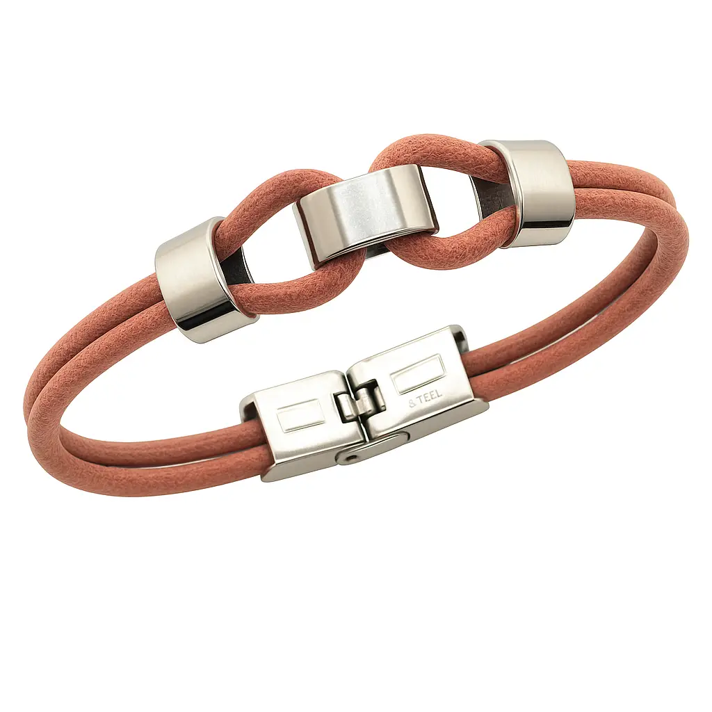 La Pulsera Nudo Infinito en Cuero y Acero Inoxidable representa unión, equilibrio y eternidad.